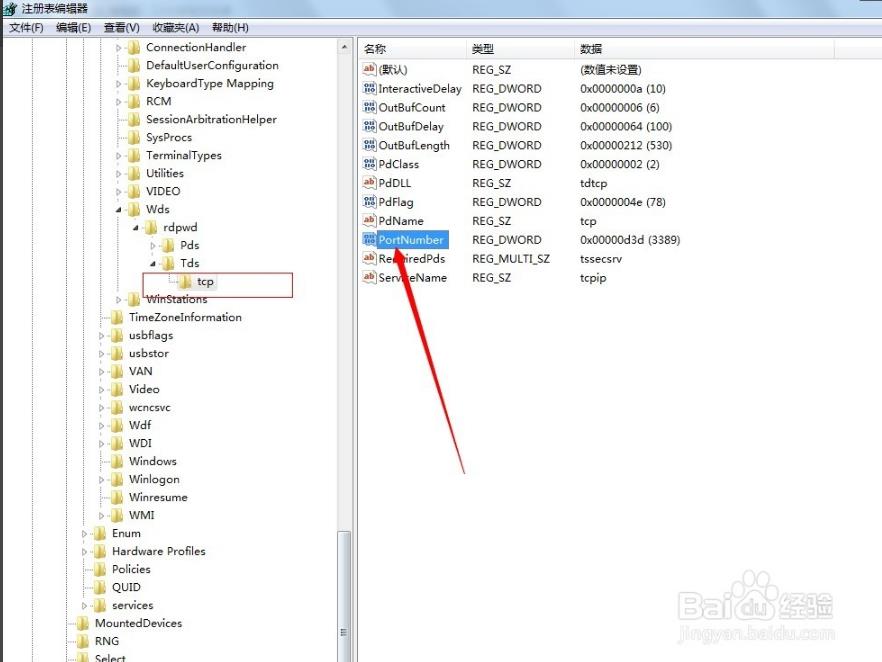 在注册表编辑器中依次点击HKEY_LOCAL_MACHINE\SYSTEM\CurrentControlSet\Control\Terminal Server\Wds\rdpwd\Tds\tcp,并找到PortNumber值。