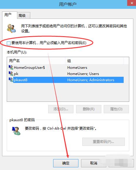 第三步:在用户帐户界面中将“要使用本计算机,用户必须输入用户名和密码”前面的勾取消,然后点击确定。