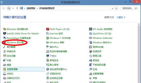 在控制面板中切换成小图标显示,点击widnows防火墙。