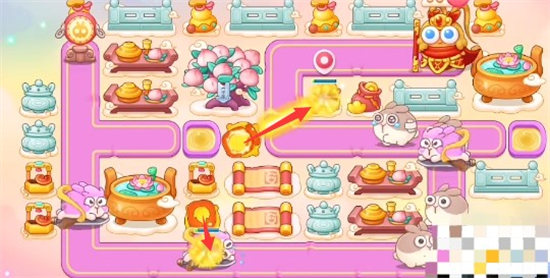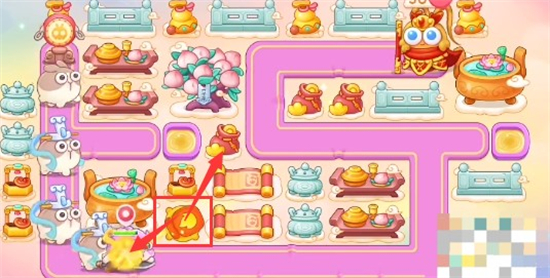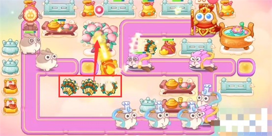 4、开完道具之后就放置多重箭锁定蟠桃树即可,有钱就在附近继续种多重箭,在拐角处放置鞭炮打小怪。