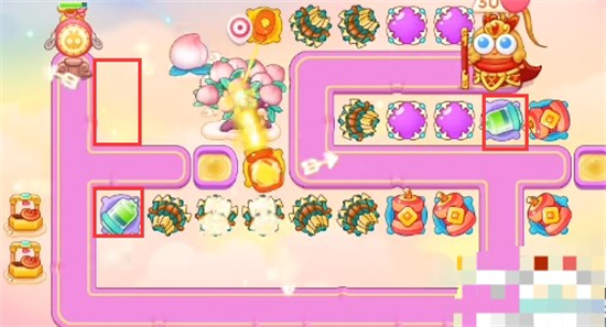1、本关能够使用的炮塔是:毒针、魔法球、多重箭、火瓶、鞭炮,我们这一关主要使用多重箭和火瓶。