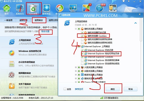 当然,如果安装的浏览器比较多的话,又不想一个一个的清理,感觉很麻烦,那么我们只能借助第三方软件了,下面小编就以金山卫士为例,教您怎么删除cookies记录。首先要找到金山卫士的图标,然后双击打开主界面,找到“垃圾清理”-"清理痕迹"-“高级设置”-“把清除cookies”打上勾就行了,然后就是清理垃圾了,这里有市面上大部分的浏览器,都支持一键清除cookies,非常简单。