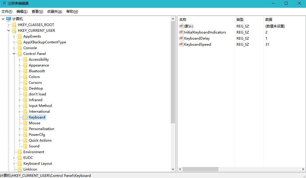 依次点击目录HKEY_CURRENT_USER \ ControlPanel \ Keyboard,把InitialKeyboardIndicators的数值设置为2即可。