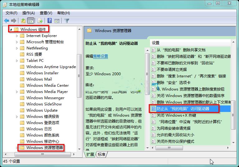 依次打开“本地计算机策略→用户配置→管理模板→Windows组件→Windows资源管理器”,选中Windows资源管理器,在右侧窗口中找到并双击打开“防止从‘我的电脑’访问驱动器”。