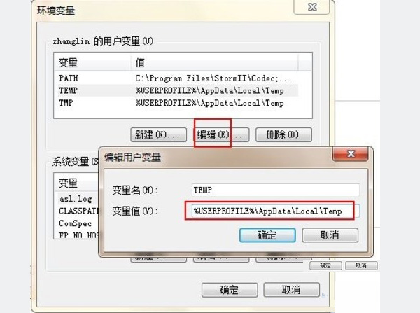 在编辑用户变量对话框中,我们看到变量值处是可以进行编辑的部分,这里已经存在原系统默认的临时文件存放地址,我们可以直接将用户和系统的temp和tmp变量都改到另外的路径即可。
