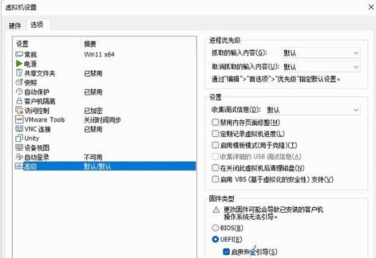 在“虚拟机设置”窗口切换到“选项”,选中“高级”,在右侧的“固件类型”区域就可以选择 “UEFI安全引导” 了。: