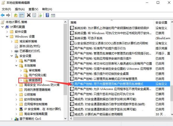 然后找到名为用户账户控制:用于内置管理员账户的管理员批准模式的策略,双击打开。