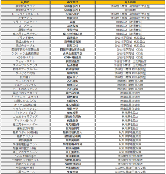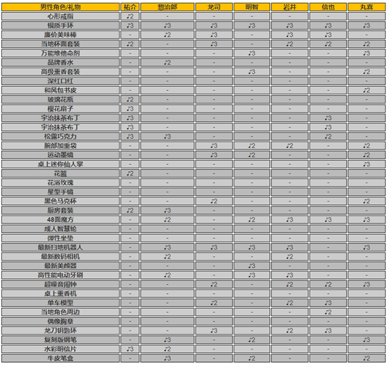 下表为各位女性角色所喜好的礼物,其中某些首饰价格很高,但只要掌握快速赚钱大法,也不是事,可恣意购买。