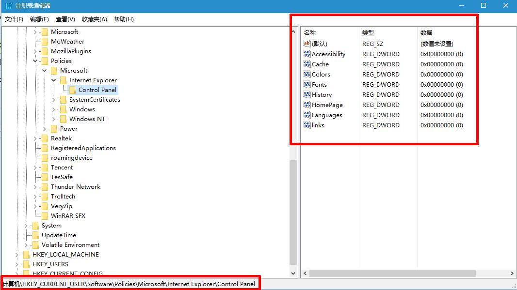 依次打开目录“HKEY_CURRENT_USER / Software / Policies / Microsoft / ControlPanel / Internet Explorer”。