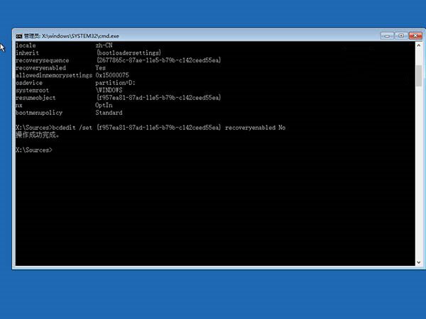 6.接着输入bcdedit /set {GUID} recoveryenabled No回车运行,运行该命令后就会暂时禁用系统的自动启动修复功能,其中的GUID即为上一步中记录的字符。