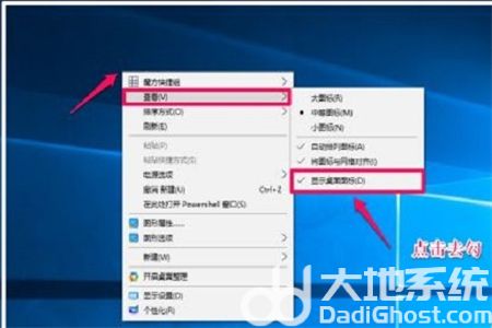 3.如果想要恢复桌面图标的话,我们可以在系统桌面上使用鼠标右键点击空白处弹出菜单键点击“查看”-“显示桌面图标”,在显示桌面图标前打勾。