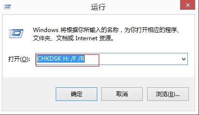 二、按Win+R打开运行窗口,输入CHKDSK H: /F /R命令,接着会弹出一个命令提示符窗口。