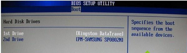 3、如果先在“Hard Disk Drives”里面选择U盘为第一启动设备,如下图所示,那么这里就会显示有U盘,那就选择U盘为第一启动设备,如下第二张图所示,在硬盘驱动器“Hard Disk Drives”选择U盘为第一启动设备“1stDrive”。