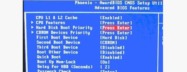 2、高级BIOS设置(Advanced BIOS Features)界面,首先选择硬盘启动优先级:Hard Disk Boot Priority。