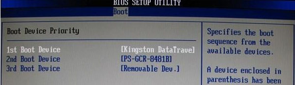2、启动优先级设备选择(BootDevice Priority)在第一启动设备(1st Boot Device)里选择U盘;上图界面中的硬盘驱动器“Hard Disk Drives”里面还没选择U盘为第一启动设备,那么下图中就不存在和显示U盘,如下图所示,可以选择移动设备“Removable Dev.”作为第一启动设备。