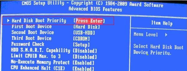 2、如下图:进入到高级BIOS设置(Advanced BIOS Features)界面,方向键控制上下,首先选择硬盘启动优先级:Hard Disk Boot Priority,进入到启动顺序选择界面。