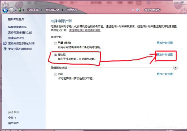 3.选择高性能并且点击更改计划设置。