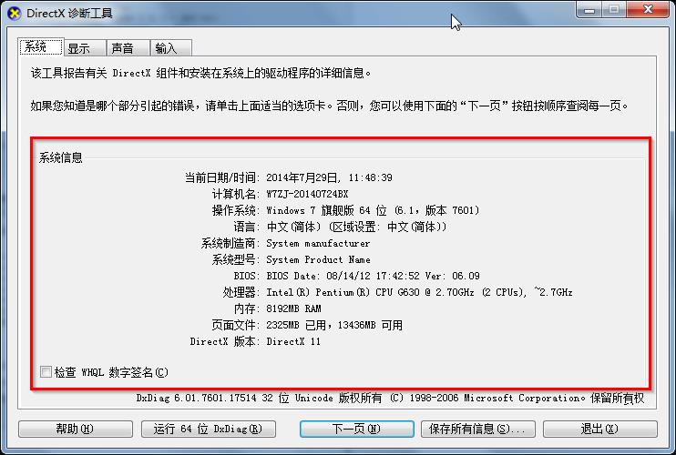 在directx诊断工具中的系统标签中我们可以看到一些电脑配置信息。