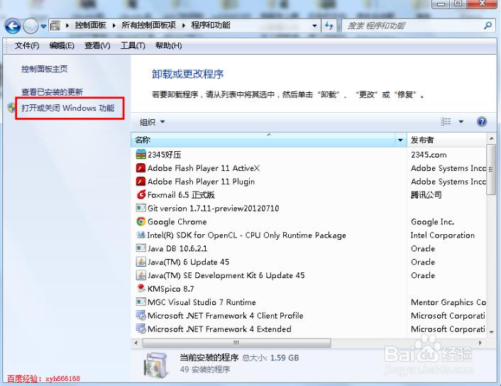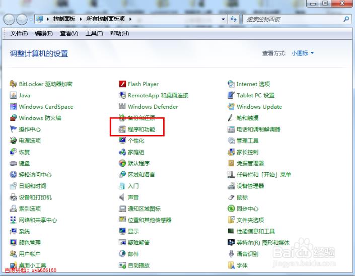 首先在开始菜单中打开控制面板,切换成小图标显示,点击程序和功能。