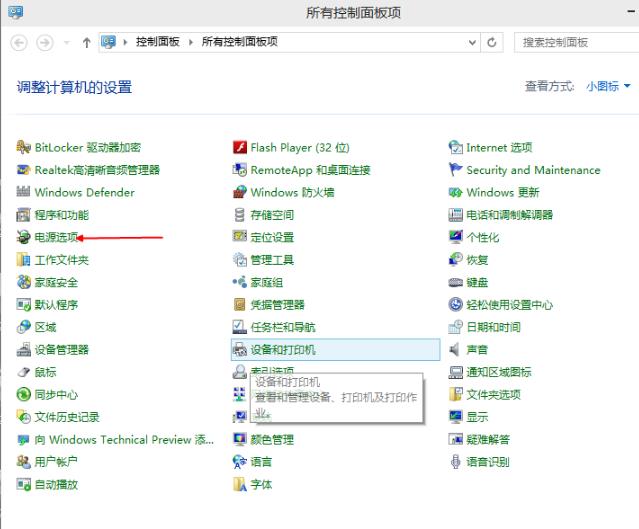 首先在开始菜单中打开控制面板,点击小图标显示,点击电源选项。