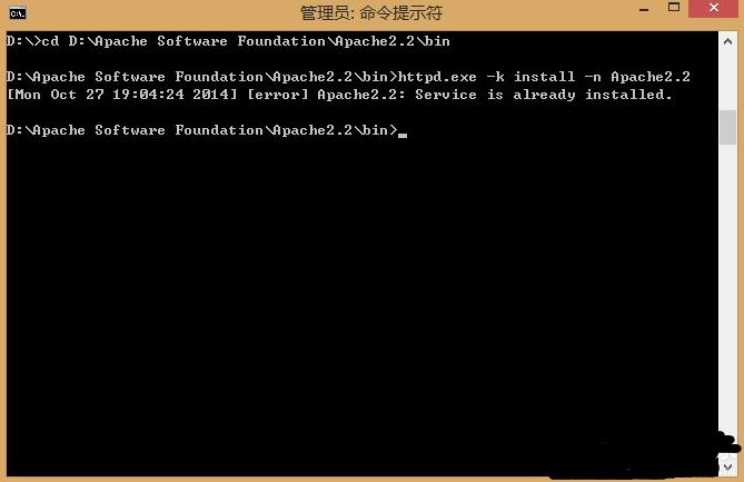 三、然后以管理员身份打开命令提示符,cd到bin目录下,并执行命令httpd.exe -k install -n Apache2.2。
