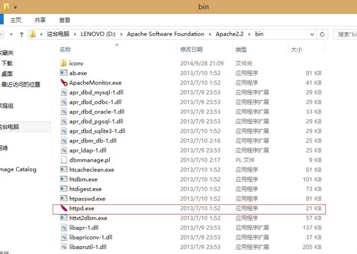 二、然后进入apache的安装目录,点击文件夹中的bin,找到httpd.exe。