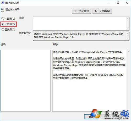 4、在打开的“阻止媒体共享”对话窗框中,将其设置更改选择为“已启用”选项,然后点击确定按钮即可;
