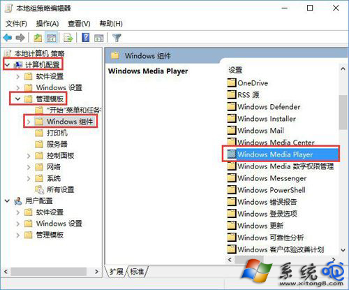 2、在“本地组策略编辑器”窗口中,依次展开“计算机配置--》管理模版--》Windows组件”命令选项,在右侧窗格中找到“Windows Media P ”选项,选中并双击打开;