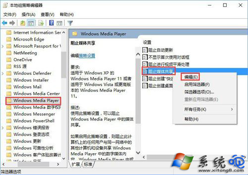 3、在“Windows Media P ”选项右侧窗格中找到“阻止媒体共享”,右键点击“阻止媒体共享”打开“编辑”选项命令;