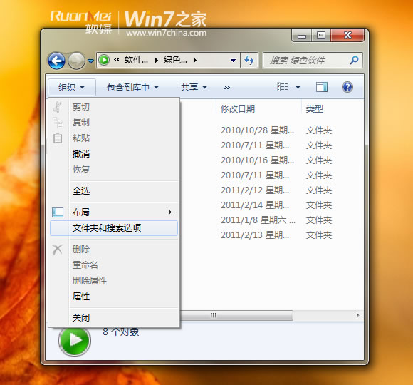 然后点击左上方第一个“组织”按钮并从中选择“文件夹和搜索选项”,弹出“文件夹选项”窗口——