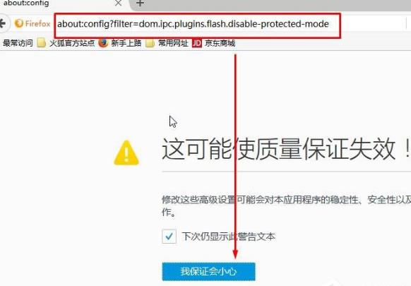 首先我们打开火狐浏览器,在搜索栏中输入about:config?filter=dom.ipc.plugins.flash.disable-protected-mode,然后点击“我保证会小心”的选项。
