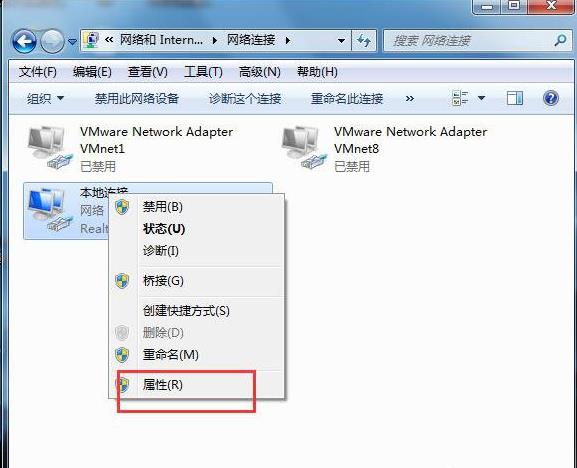 3、在打开的窗口中,右击“本地连接”,在弹出的菜单中选择“属性”。