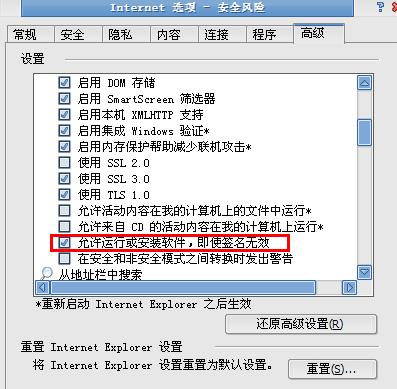 回到internet选项的窗口,点击高级,勾选允许运行或安装软件,即使签名无效的选项。