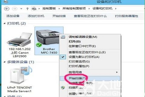 3.在打开的设备和打印机中,右键可以扫描的设备,选择“开始扫描”;