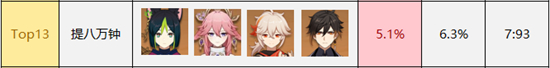 只能说神鹤万心确实非常强势的配队,也是玩家公认的最高配永冻队,已经霸榜了好几个版本。但是由于这个队伍全部都是限定五星角色,造价非常高,因此这个队伍的持有率仅有13.0%。