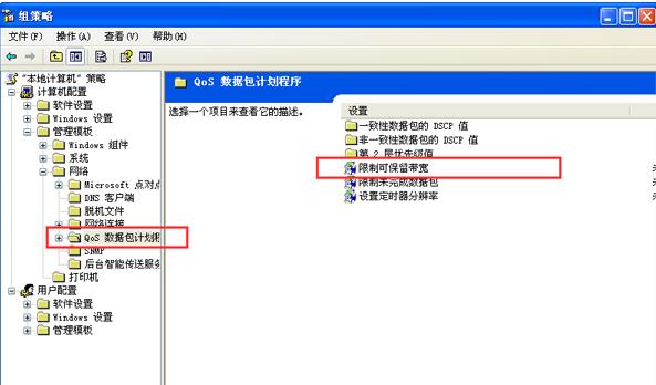 在组策略编辑器中依次点击计算机配置——管理模版——网络——Qos数据包计划程序,双击打开限制可保留宽带。
