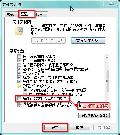 在查看中找到隐藏已知文件类型的扩展名,去掉前面的勾即可。