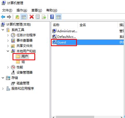 在计算机管理窗口汇总点击本地用户和组——用户,双击右侧guest账户。