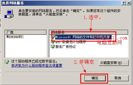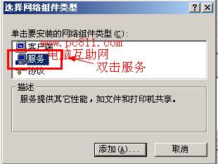 第4步:在弹出的“选择网络组件类型”窗口中,双击“服务”,并在弹出的“选择网络服务”窗口中双击“Microsoft网络的文件和打印机共享”。