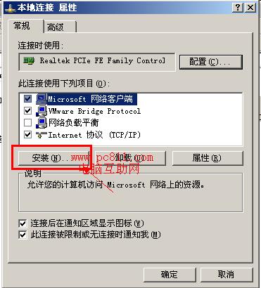 第3步:在打开的本地连接属性中,检查是否有“Microsoft网络的文件和打印机共享”,如果没有就单击“安装”按扭。