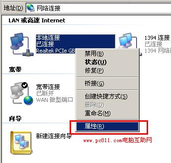 第2步:找到网络连接后,找到正在连接网络的本地连接(或无线网络连接),在此项上右键选择属性。