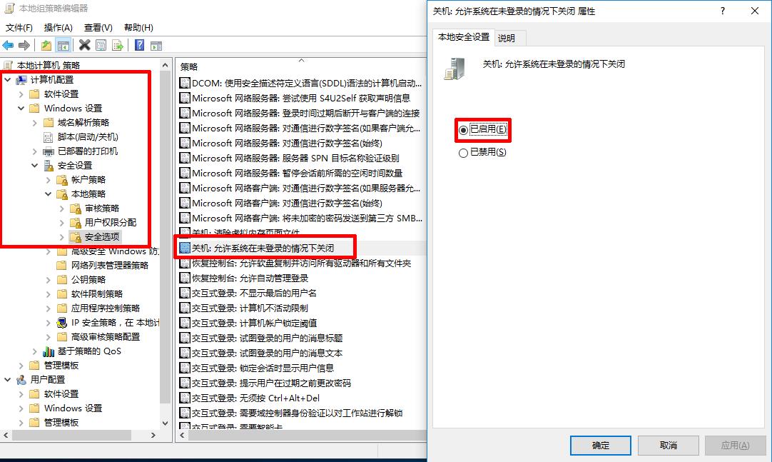 首先我们可以在搜索栏中输入“组策略”打开组策略编辑器(也可以Win+R输入“gpedit.msc”),在左侧栏目导航位置到“计算机设置-Windows设置-安全设置-本地策略-安全选项”,找到一个名叫“关机:允许系统在未登录的情况下关闭”,鼠标双击它,将“已禁用”更改成“已启用”。
