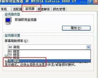 接着会弹出一个窗口,点击监视器,设置一下屏幕刷新率即可。