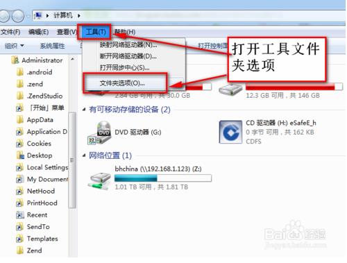 首先点击桌面上的计算机图标,然后点击菜单栏中的工具,打开文件夹选项。
