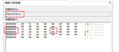 4、然后再找到“FailureActions”键并双击进行编辑,将“00000010”和“00000018”行中的第五个数值,由原来的“01”改为“00”,再单击“确定”。