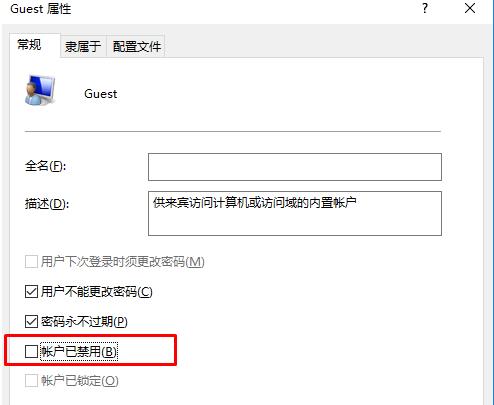 把账户已禁用这个选项中的勾去掉,这样就可以在深度win10系统中打开guest账户了。