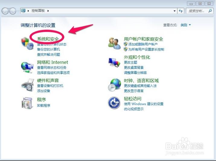 首先我们在开始菜单中打开控制面板,点击系统和安全。