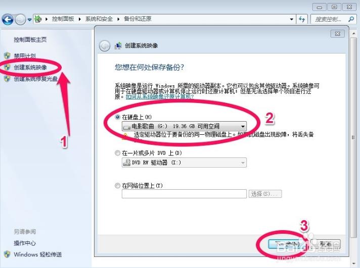 然后点击左侧列表中的创建系统映像,选择一下保存备份的位置,点击下一步。