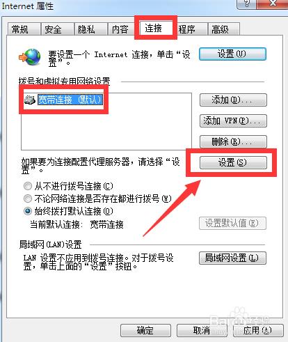 弹出窗口后,点击连接标签,选择宽带连接,点击设置。