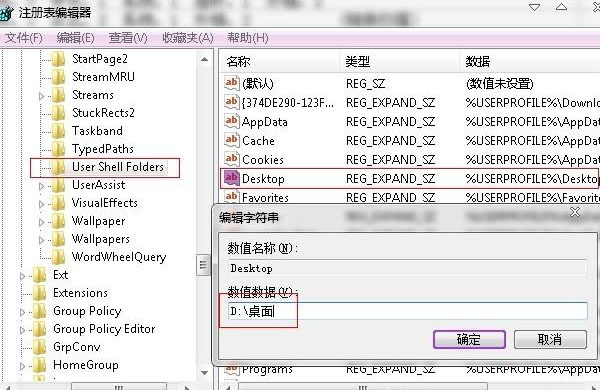 三、在窗口右边找到在窗口的右边找到字符串值名“Desktop”,将其值修改为预设好的路径。(如:我想把桌面放在“D盘-桌面”的文件夹,将其值修改为:“D:\桌面”即可)。